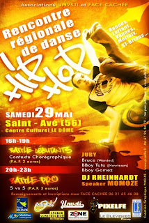 danse hip-hop, domiciliée à St Avé, "Face cachée". Animée par Stéphane Vorn elle organise des cours, des stages, des événements hip-hop. C'est elle qui, avec l'association UNVSTI organise au Dôme de St Avé, le samedi 29 mai, une rencontre régionale de danse hip-hop.Un groupe à suivre.